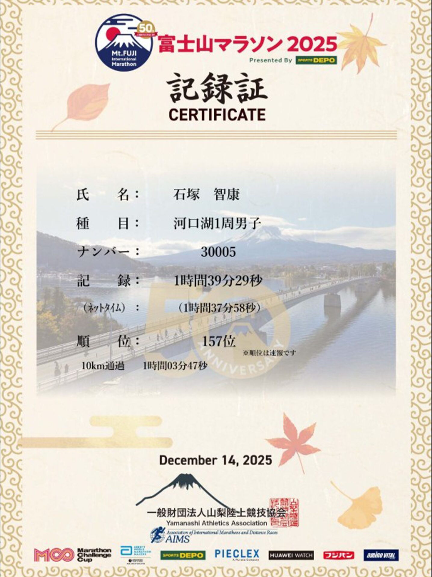 - 2025年12月15日 第14回富士山マラソンに参加してきました(17km河口湖一周)。レース中は曇りでしたが、帰り道できれいな富士山を見ることができました!